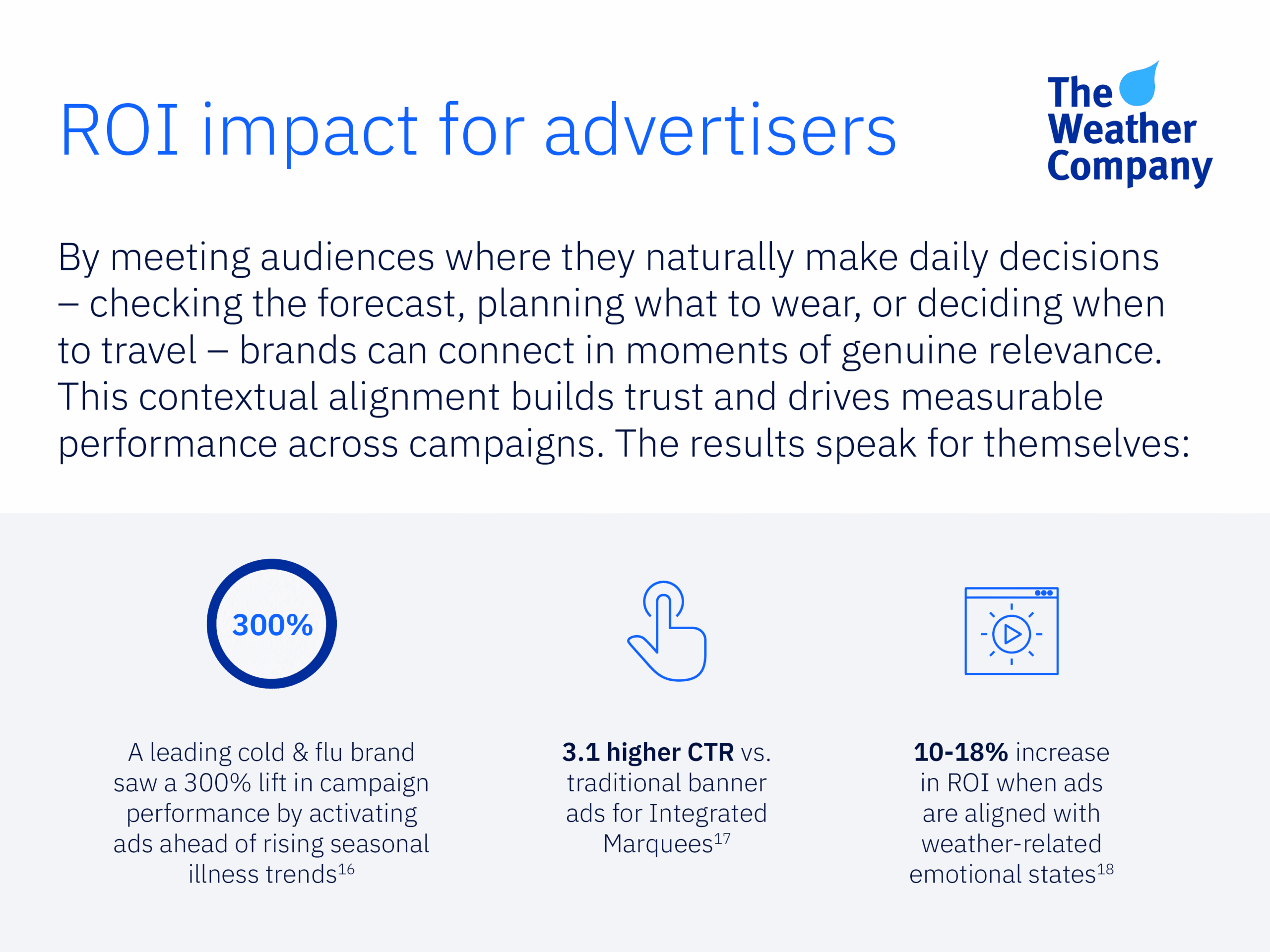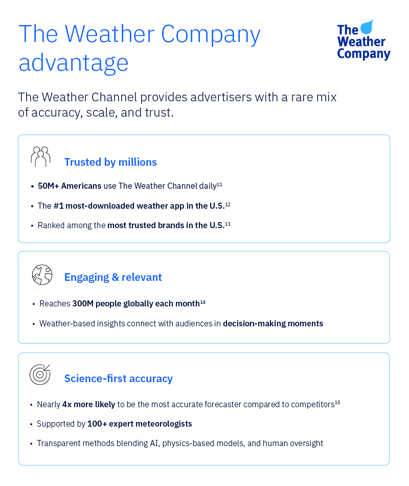 Today’s advertisers need more than reach. They need the right balance of safety, performance, and trust at scale. With a foundation rooted in science, a commitment to user trust, and a proven ability to deliver opportunities in advertising that are both relevant and effective, The Weather Channel advertising solutions provide an environment where brands can grow with confidence.