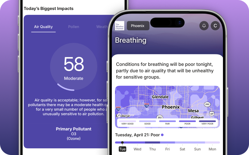 Experience The Weather Channel’s Air Quality Index on web and in-app within the “Breathing” sections.