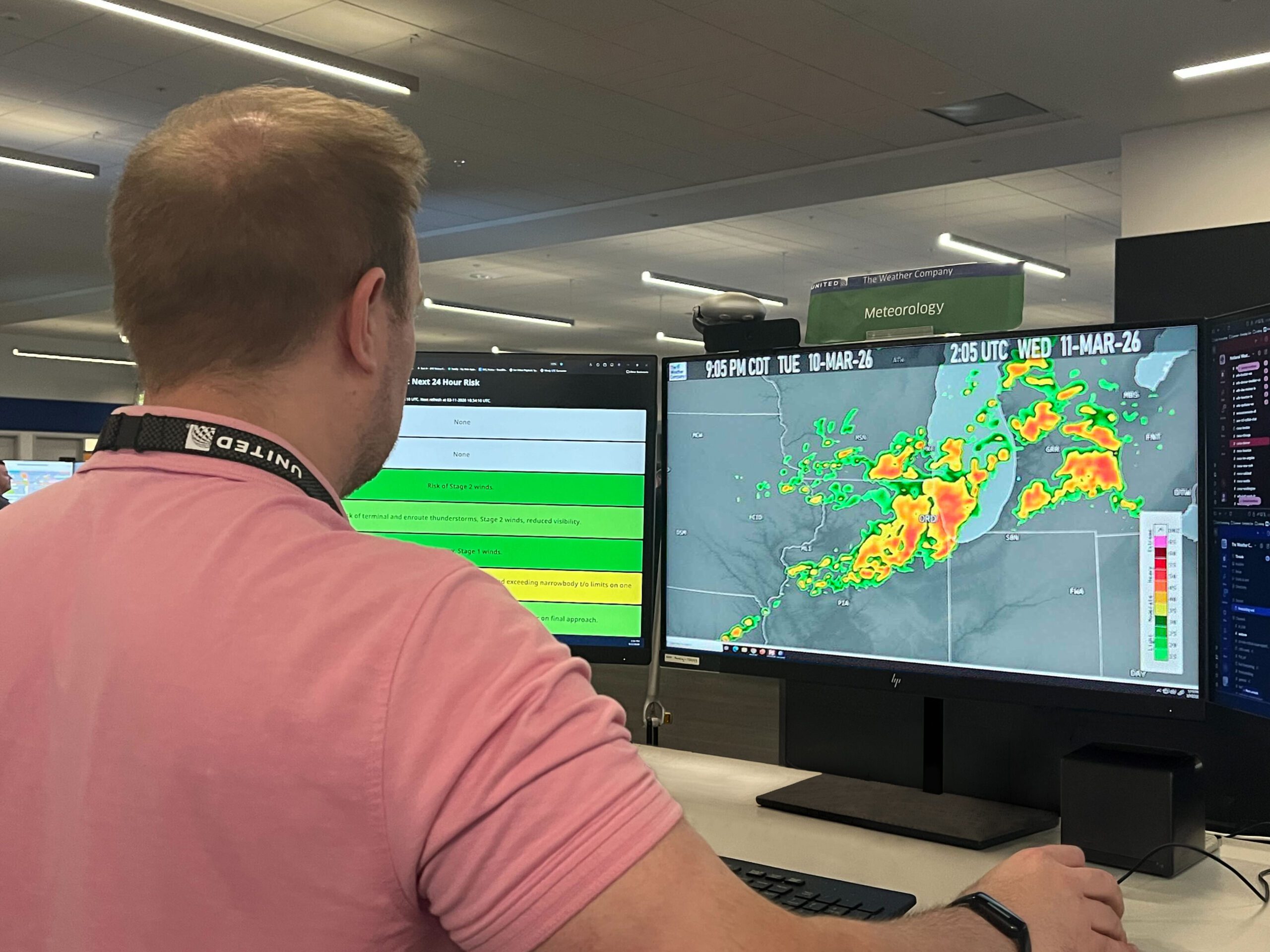 Seen here: Nick Elwell, a meteorologist with The Weather Company embedded at United’s Network Operation Center (NOC), is shown leveraging advanced weather visualization tools and real-time dashboards. By translating complex weather data into critical, forward-looking insights, embedded meteorologists provide essential decision support to United’s operations team, helping to optimize routes, improve efficiency, and enhance safety across the global network.
